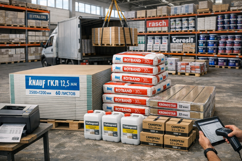 Доставка материалов на объект в день заказа исключает простой бригад. Утренние заявки — вечерняя разгрузка, вечерние — следующее утро. Полная комплектация заказа: материалы + инструменты + расходники. Краны-манипуляторы для гипсокартона, подъёмники для керамогранита.