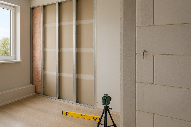 Каркас из CD/CE профилей 60×27 мм, шаг стоек 600 мм, ГКЛ 12,5 мм в 1-2 слоя. Минвата 50-100 мм для звукоизоляции Rw=45-52 дБ. Вес конструкции 25 кг/м². Выравнивание под покраску/обои за 1,5-2 мм. Монтаж 1-2 дня на комнату 20 м².