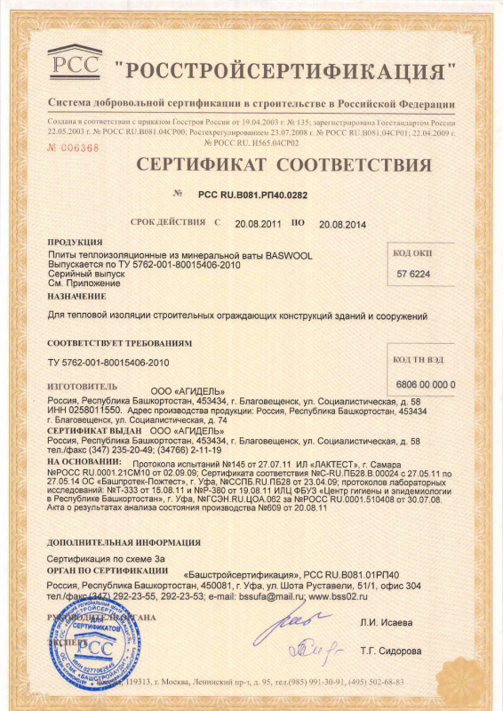 Материал: гидрофобизированная минеральная вата