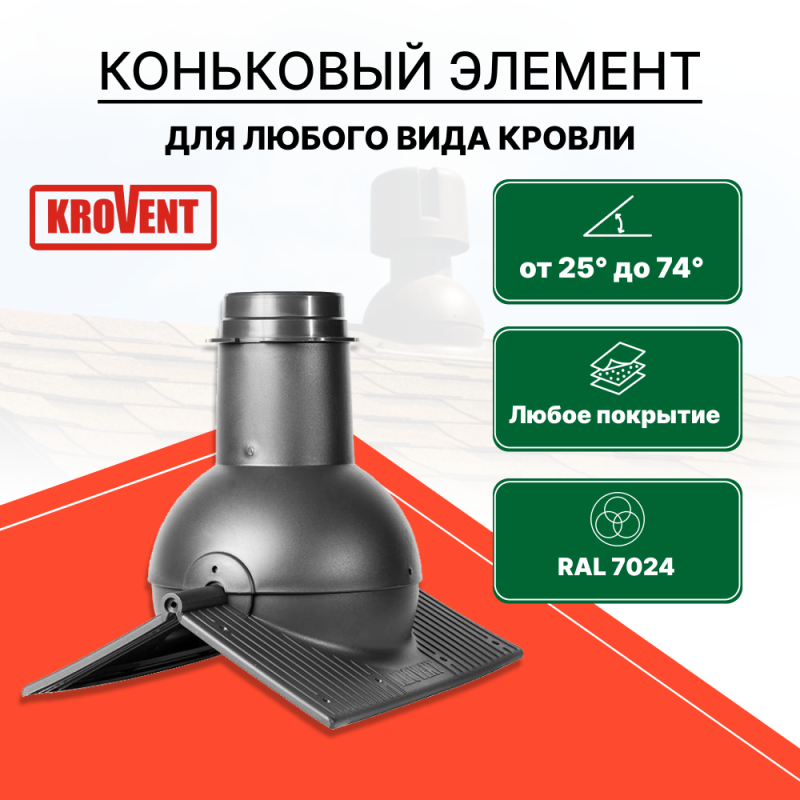 Назначение: Универсальный коньковый элемент для вентиляции подкровельного пространства и чердачных помещений. Может использоваться для вывода кухонной вытяжки и вытяжной вентиляции.