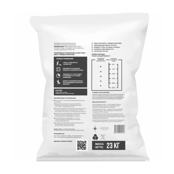 Противогололедный материал прекрасно справляется со своей задачей при температуре до -25 градусов.