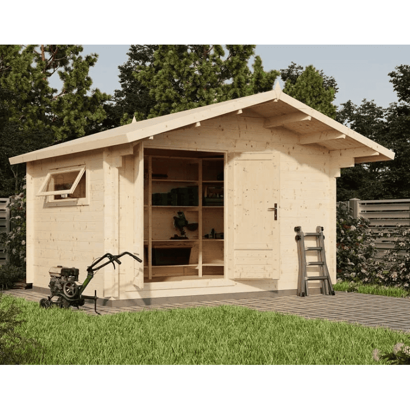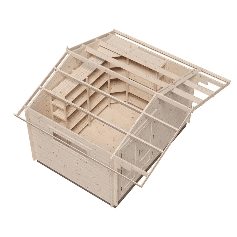 Описание: Закрытое сборное строение из профилированного бруса для организации рабочего пространства и хранения садового инвентаря. Экологически безопасный материал проходит камерную сушку и готов к последующей покраске.