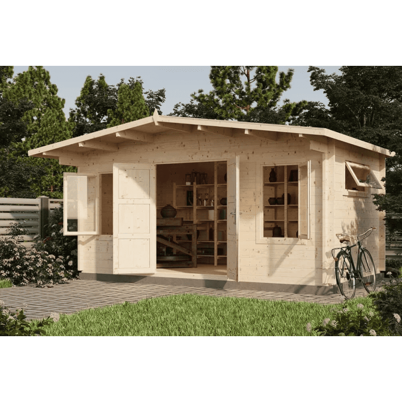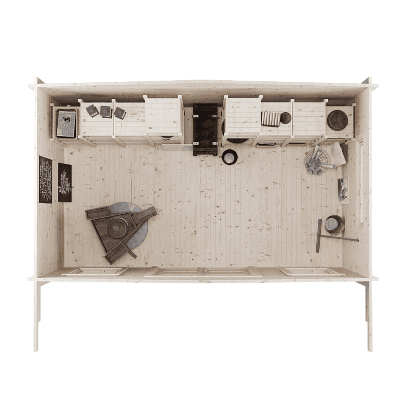 Описание: Закрытое сборное строение из профилированного бруса для организации рабочего пространства и хранения садового инвентаря. Экологически безопасный материал проходит камерную сушку и готов к последующей покраске.