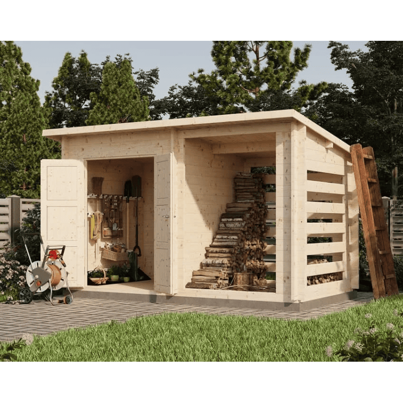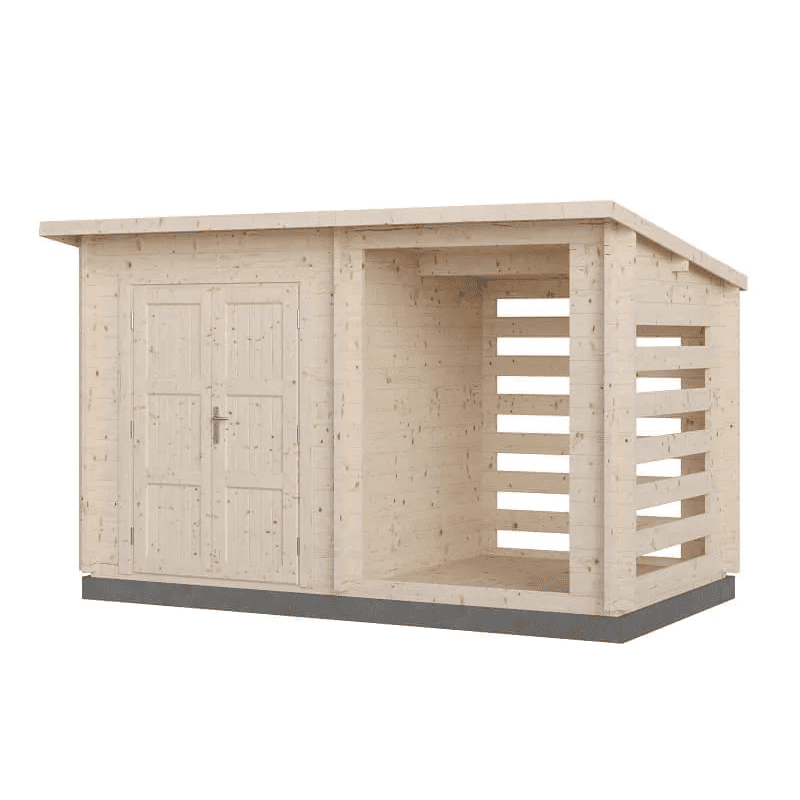 Описание: Закрытое сборное строение из профилированного бруса с отдельной секцией для хранения дров. Экологически безопасный материал проходит камерную сушку и готов к последующей покраске.