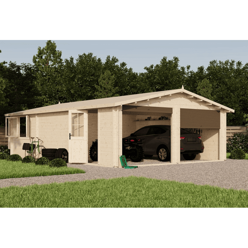 Описание: Просторная деревянная постройка из профилированного мини-бруса для сезонной эксплуатации. Увеличенная внутренняя площадь и высота стен обеспечивают комфортное использование в качестве гаража на 2 автомобиля, мастерской или многофункциональной хозяйственной постройки.